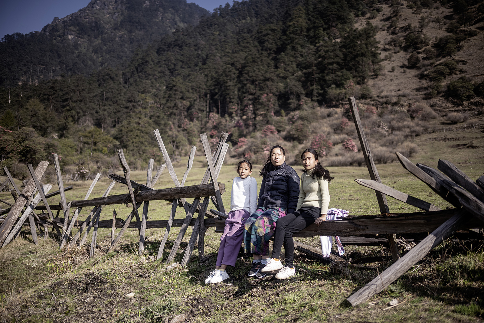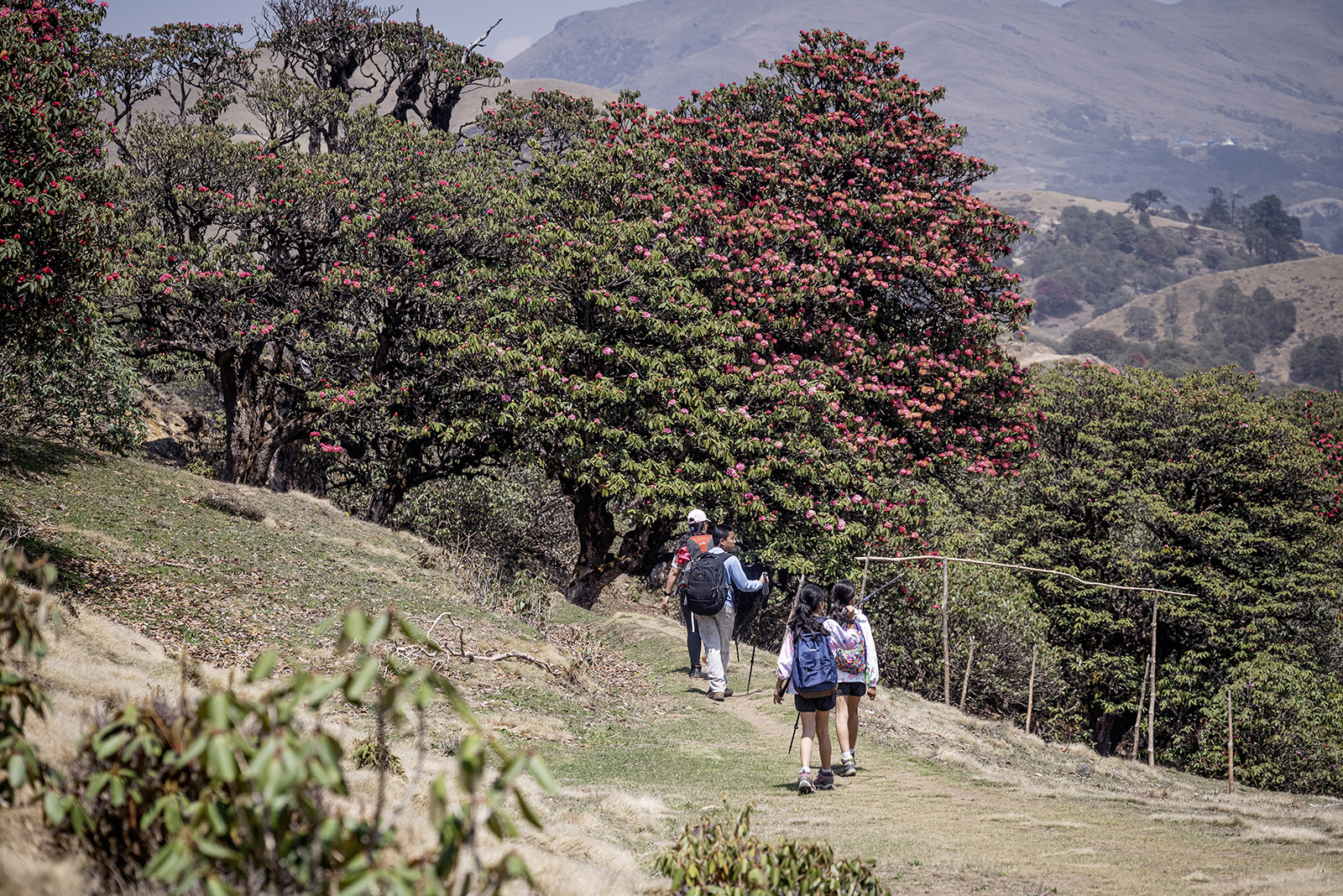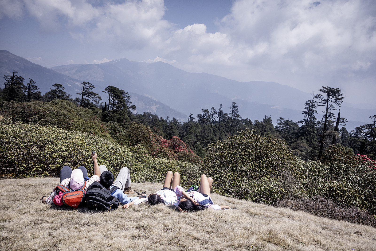 After enjoying the view and taking photos for about an hour, clouds started to cover the mountains. We walked down slowly to Jasmane Bhanjyang for lunch. The trail was steep in some places. After lunch, we continued, first uphill, then a gentle climb, and finally a long downhill walk to Taktor Village. We passed through pine forests and thick mist. It started raining, so we used raincoats, which made walking a bit harder for the kids. Along the way, we saw footprints and poops of wild animals, which made Doma a little nervous.